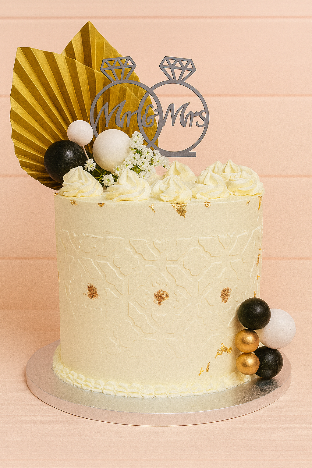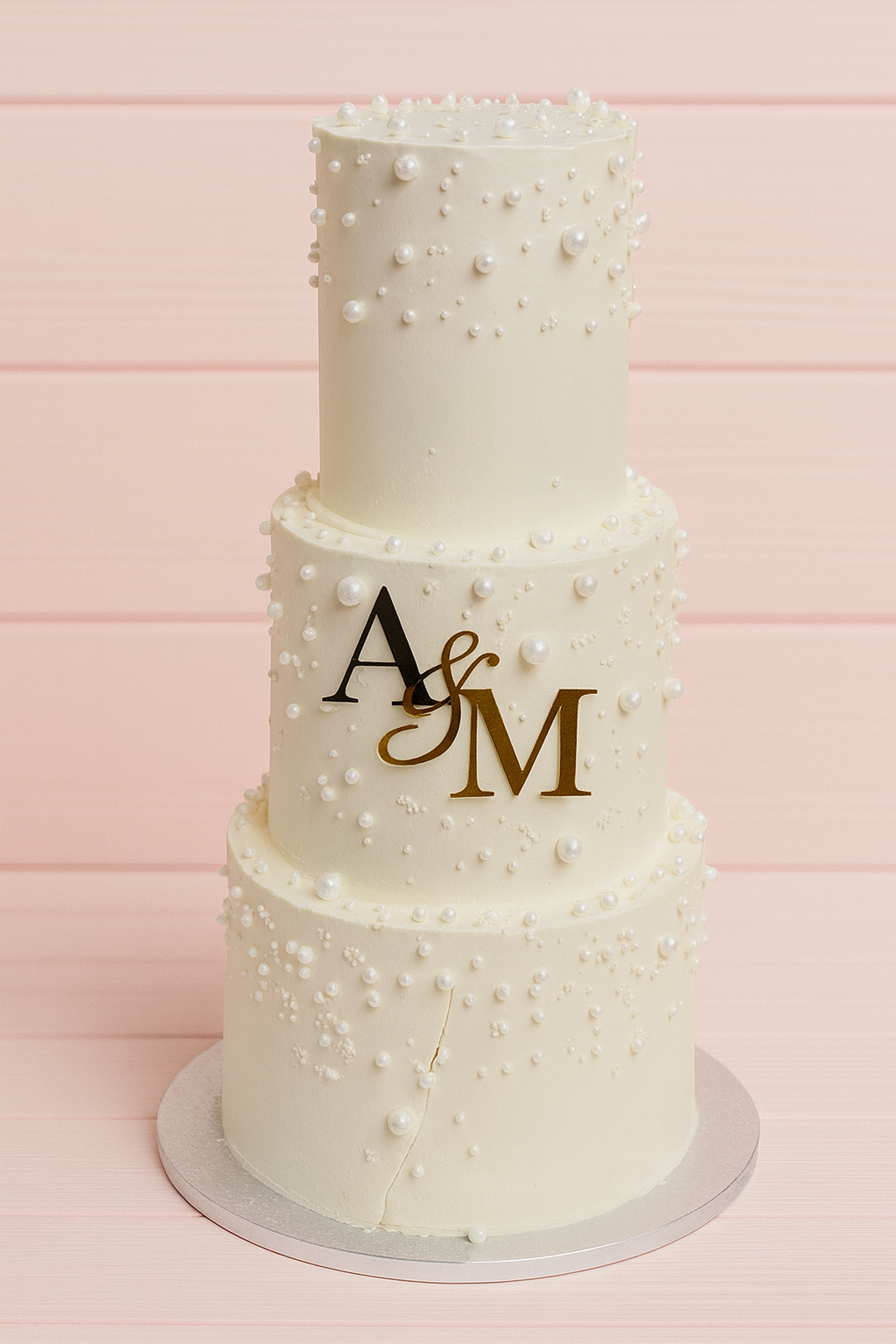 Raffiné et intemporel, ce gâteau de mariage perlé présente trois étages blancs ornés de perles et d’un monogramme doré des initiales. Choisissez les couleurs, le texte et les saveurs : chaque pièce est réalisée artisanalement pour s’accorder à votre thème.