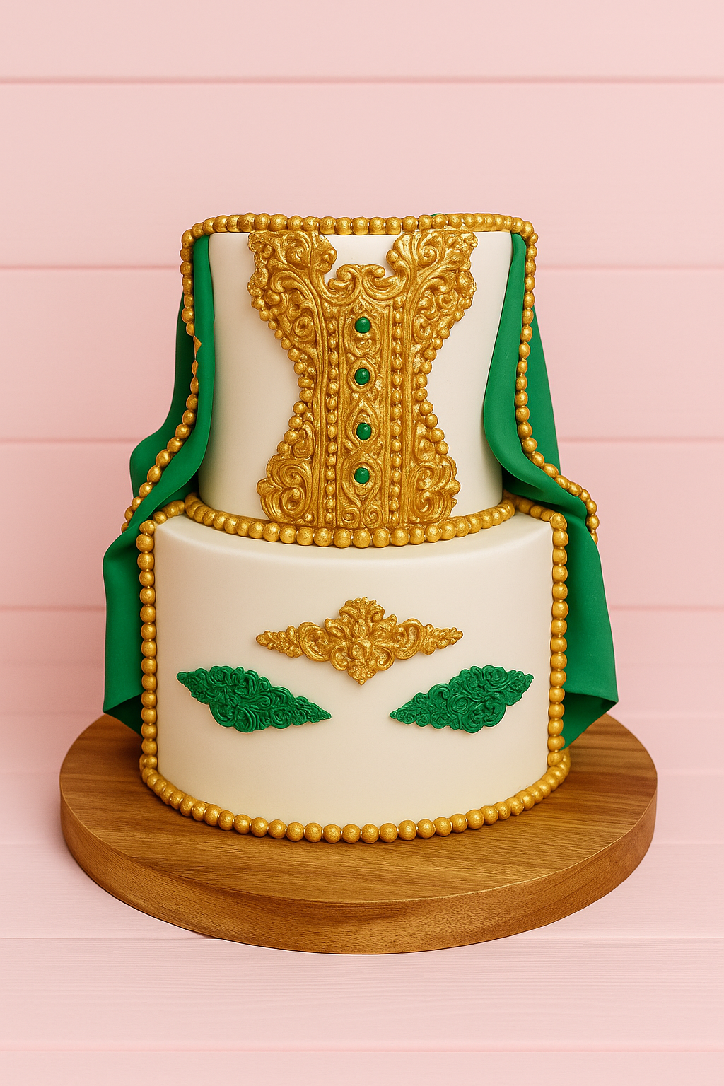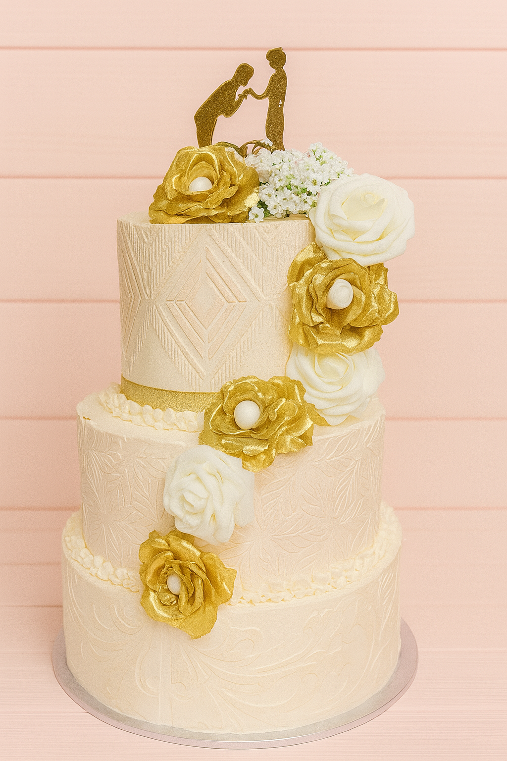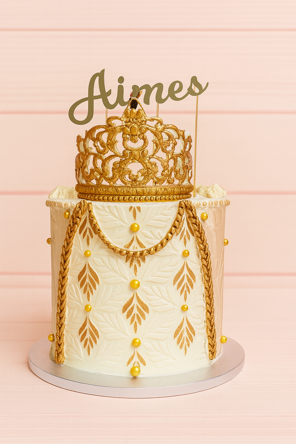 Décoré de roses rouges profondes, de perles blanches délicates et d’un topper doré personnalisé, il incarne la passion et le romantisme.