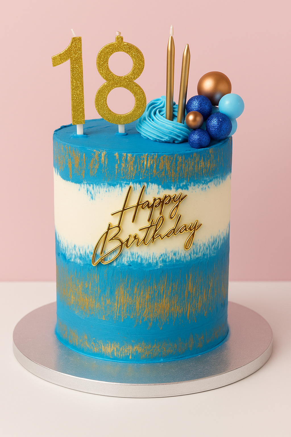 Célébrez vos 18 ans avec style grâce à ce somptueux gâteau d’anniversaire bleu et doré, une création élégante signée BGS Pâtisserie à Nantes.