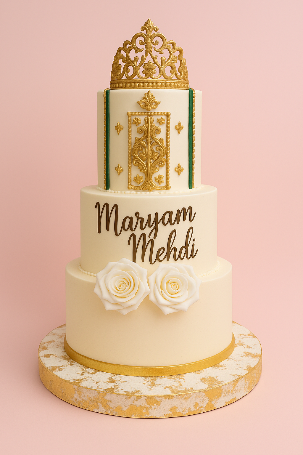 Raffiné et intemporel, ce gâteau de mariage perlé présente trois étages blancs ornés de perles et d’un monogramme doré des initiales. Choisissez les couleurs, le texte et les saveurs : chaque pièce est réalisée artisanalement pour s’accorder à votre thème.