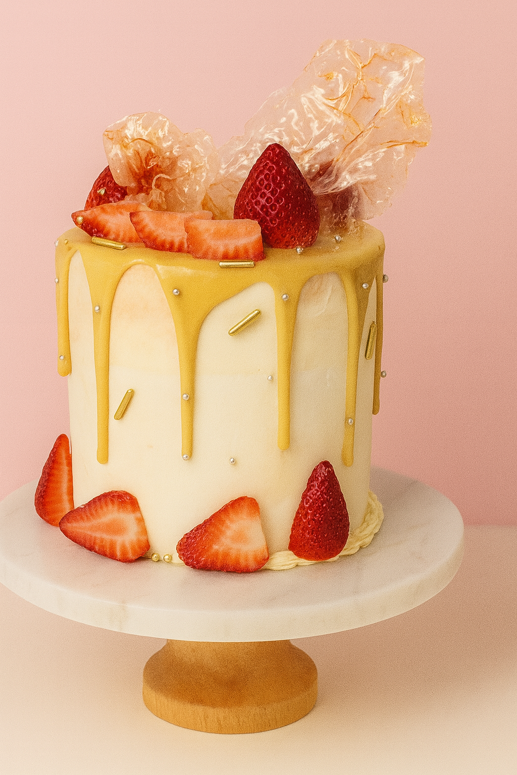 Décoré de fraises fraîches, d’un drip doré au caramel et de détails en sucre soufflé, ce dessert marie élégance et gourmandise.