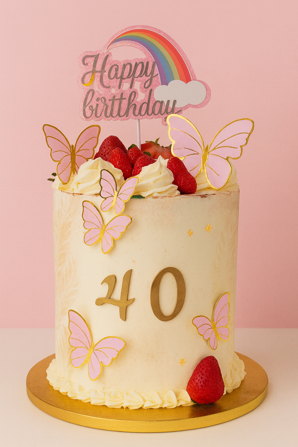 Décoré de papillons roses délicats, d’un arc-en-ciel scintillant et de fraises fraîches, il allie raffinement et légèreté.