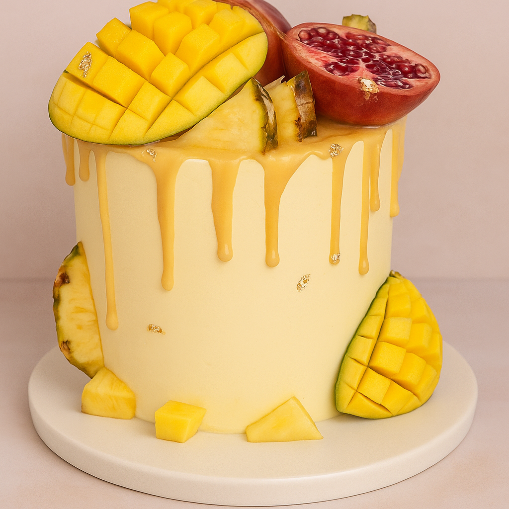 Gâteau tropical ultra frais : drip crème, mangue taillée en hérisson, ananas et fruit de la passion. Personnalisation possible (prénom/âge). 12+ saveurs, fabrication artisanale.